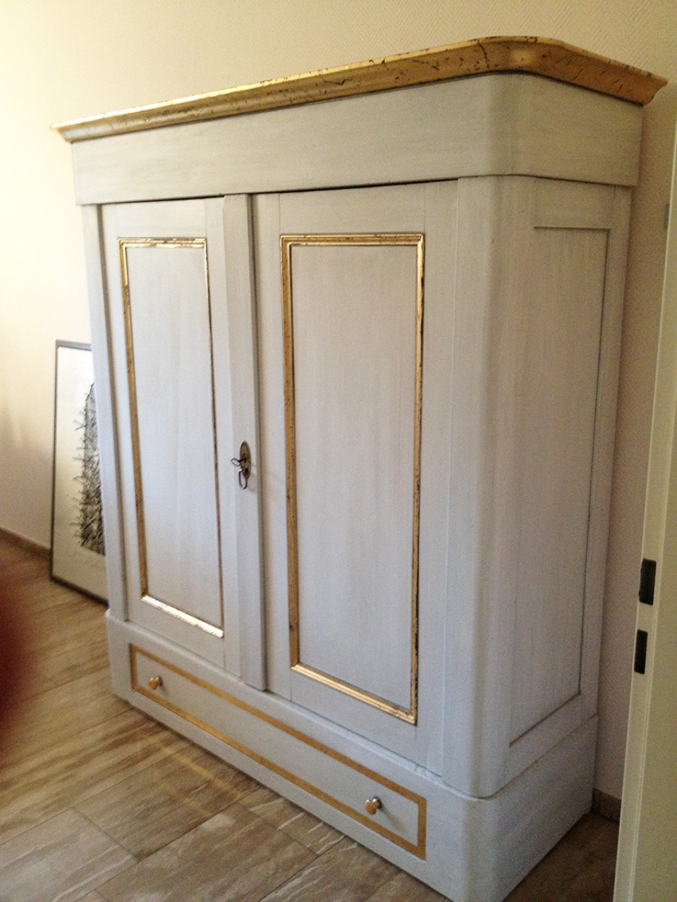 Antiker Dielenschrank aus dem 19. Jahrhundert, cremefarben gefasst mit Blattvergoldung der Zierleisten.